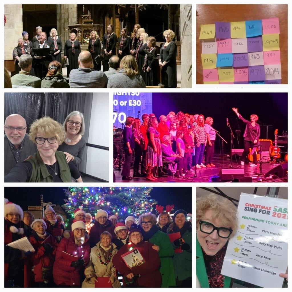 Then the festive events began. Sing for SASH at Castle Howard , Helmsley lights with Easingwold Community Singers and Helmsley Arts Centre Singers , Entertaining Angels for Helmsley Arts Centre and Helmsley Parish Church , Easingwold Community Christmas at Easingwold Galtres Centre , all the amazing performances from the children at Wigginton Primary School , carols at The Commercial, Easingwold , the festive singalong lunch at The Olive Branch, Easingwold , finishing up with my 2 festive workshops – a fun, intergenerational musical bridges for Singing For All with Jessa CIC , and a contrasting, chilled, ‘yuletide bridges’ which turned out to be one of my favourite events, working on a selection of new and lesser known seasonal songs from writers like Lou Blackburn and Jake Alexander with a lovely small group.